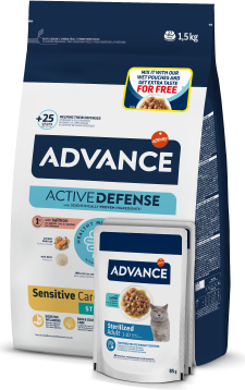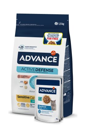 ADVANCE CAT STERILIZED SENSITIVE 1,5KG + 2 WETSTZ COD - полнорационный сухой и влажный корм для взрослых стерилизованных кошек от 1 до 10 лет с чувствительной пищеварительной системой. С лососем. ЛОСОСЬ ИДЕАЛЬНО ПОДХОДИТ ДЛЯ КОШЕК С ЧУВСТВИТЕЛЬНОЙ ПИЩЕВАРИТЕЛЬНОЙ СИСТЕМОЙ.