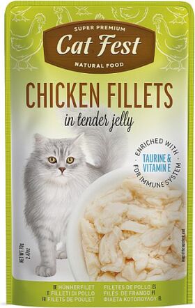 Cat Fest Chicken in Jelly, 70 г Полноценный корм из кусочков курицы в желе подарит вашему питомцу незабываемые вкусовые ощущения. Состав: куриное филе 58%, куриный бульон 40%, пребиотики FOS, рыбий жир анчоуса, витамин E, таурин, экстракт цикория, минералы. Аналитические компоненты: сырой белок 9,5%, сырой жир 1,5%, сырая клетчатка 1%, сырая зола 1%, влажность 89%, энергетическая ценность — 42,2 ккал. Подавайте корм при комнатной температуре, чтобы он раскрыл свой вкус. Хранить в сухом и прохладном месте. Рекомендуется давать до 3 пакетиков в день в зависимости от размера и активности питомца. Обеспечьте кошке постоянный доступ к свежей воде. |