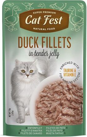 Cat Fest Филе утки в желе, 70 г - полноценный корм для взрослых кошек, филе утки в нежном желе, нежный и питательный корм. Состав: филе утки 58%, утиный бульон 40%, анчоусный рыбий жир, пребиотики FOS, витамин E, таурин, экстракт цикория, минералы. Аналитические компоненты: сырой протеин 11%, сырой жир 2%, сырая клетчатка 1%, зола 1,5%, влажность 89%. Подавайте корм при комнатной температуре, чтобы он раскрыл свой вкус. Хранить в сухом и прохладном месте. Рекомендуется давать до 3 пакетиков в день в зависимости от размера и активности питомца. Обеспечьте кошке постоянный доступ к свежей воде. |