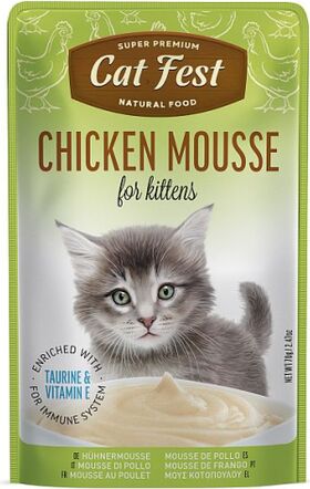 Cat Fest kons. Kitten chicken mousse kons., 70 г — влажный прикорм с курицей с нежной муссовой текстурой, идеально подходит для маленьких котят. Состав: курица 58%, куриный бульон 40%, анчоусный рыбий жир, пребиотик ФОС, витамин Е, таурин, тапиока, экстракт цикория, фруктоза, минералы. Аналитические компоненты: сырой протеин 9,5%, сырой жир 1,5%, сырая клетчатка 1%, зола 1%, влажность 89%, энергетическая ценность — 36,92 ккал. Применение: Идеально подходит для ежедневного дополнительного питания котят всех пород. Подавать при комнатной температуре. Хранить в сухом прохладном месте. Рекомендуется давать 2–3 пакетика в день в зависимости от возраста и уровня активности котенка. Обеспечить доступ к свежей воде. |