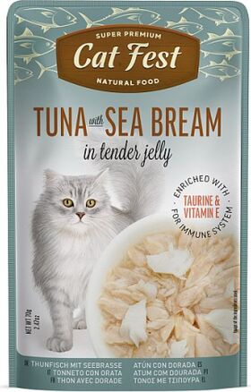 Cat Fest консервы. Тунец с морским окунем в желе, 70 г - влажный прикорм для взрослых кошек, кусочки морского тунца и морского окуня в желе. Состав: тунец 54%, морской окунь 6%, рыбный бульон 38%, пребиотики FOS, рыбий жир анчоуса, витамин E, таурин, экстракт цикория. Аналитические компоненты: сырой протеин 10%, сырой жир 0,8%, сырая клетчатка 1%, сырая зола 1,5%, влажность 89%, энергетическая ценность – 46,4 ккал. Подавайте корм при комнатной температуре, чтобы он раскрыл свой вкус. Хранить в сухом и прохладном месте. Рекомендуется давать до 3 пакетиков в день в зависимости от размера и активности питомца. Обеспечьте кошке постоянный доступ к свежей воде. |