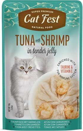Cat Fest Tuna with Shrimp in Jelly, 70 г - полноценный влажный корм для взрослых кошек, кусочки филе океанического тунца с цельными креветками в желе.