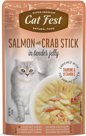 Филе лосося с крабовыми палочками в желе Cat Fest, 70 г - полноценный корм для взрослых кошек, дикий лосось с крабовыми палочками в желе, нежный и питательный корм. Состав: лосось 54%, крабовые палочки 6%, рыбный бульон 38%, анчоусный рыбий жир, пребиотики FOS, витамин E, таурин, экстракт цикория, минералы. Аналитические компоненты: сырой протеин 8,5%, сырой жир 2,5%, сырая зола 1,5%, сырая клетчатка 1%, влажность 89%. Подавайте корм при комнатной температуре, чтобы он раскрыл свой вкус. Хранить в сухом и прохладном месте. Рекомендуется давать до 3 пакетиков в день в зависимости от размера и активности питомца. Убедитесь, что у вашей кошки всегда есть доступ к свежей воде. |