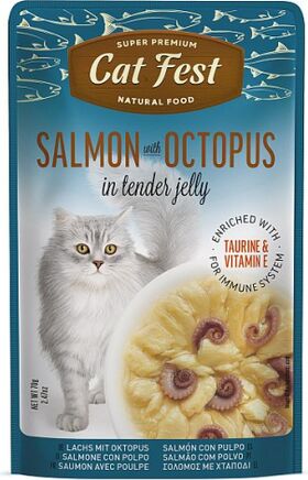 Филе лосося с осьминогом в желе CatFest, 70 г - дополнительный влажный корм для взрослых кошек, дикий лосось с осьминогом в желе, нежный и питательный корм.