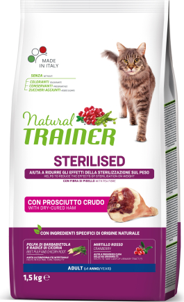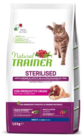 Trainer Natural NATURAL TRAINER CAT ADULT STERILISED DRY-CURED HAM&PEA 1.5 kg - полноценный и сбалансированный корм для стерилизованных взрослых кошек с 1 года.