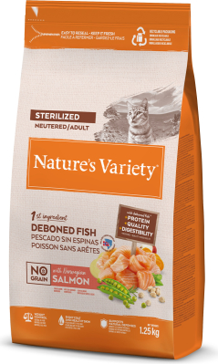 Natures Variety Nature's Variety Cat No Grain Adult Sterilized Norwegian Salmon 1,25 кг — полнорационный сухой корм для взрослых стерилизованных кошек, беззерновой, с очищенным от костей норвежским лососем.