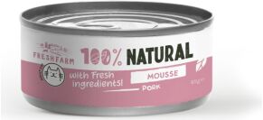 PF Fresh Farm CAT Mousse with Pork 85 гр - полнорационный корм для кошек, нежный, воздушный паштет со свининой. СОСТАВ: свинина 58%, свиная печень 4%, горох 1%, гороховая мука, лососевое масло 0,5% АНАЛИТИЧЕСКИЙ СОСТАВ: Влага 78,0%, сырой протеин 11,0%, сырая клетчатка 0,5%, сырые масла и жиры 7,0%, сырая зола 3,0%. |